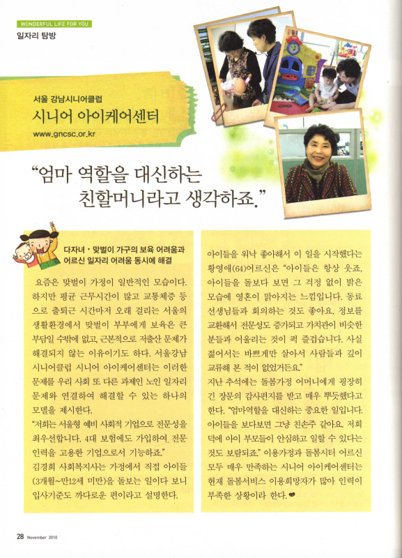 백세동안 2010년 11월호 일자리탐방에 소개된 시니어 아이케어(i-care) 센터 내용입니다 ^ㅡ^