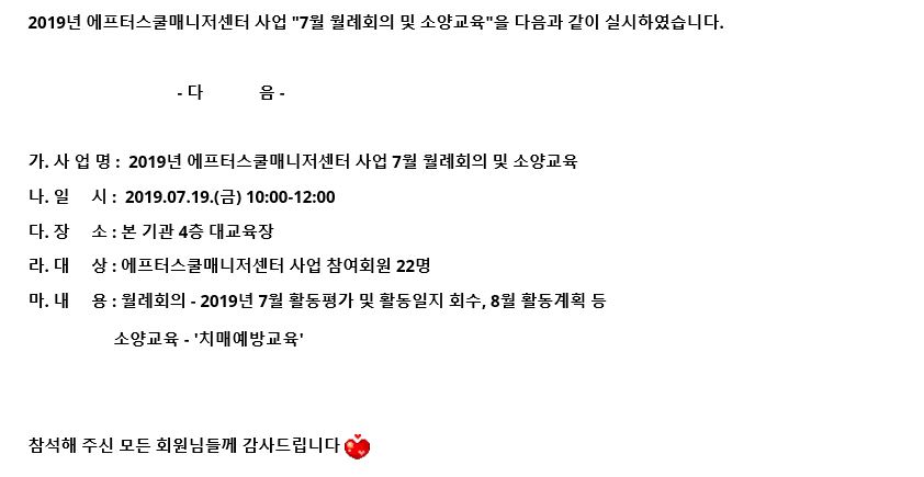 에프터스쿨매니저센터 | [에프터스쿨매니저센터] 7월 월례회의 및 소양교육 실시 완료 페이지 정보 작성자 작성일19-07-19 14:25 조회8,651회 댓글0건 관련링크 본문 이전글 다음글 목록