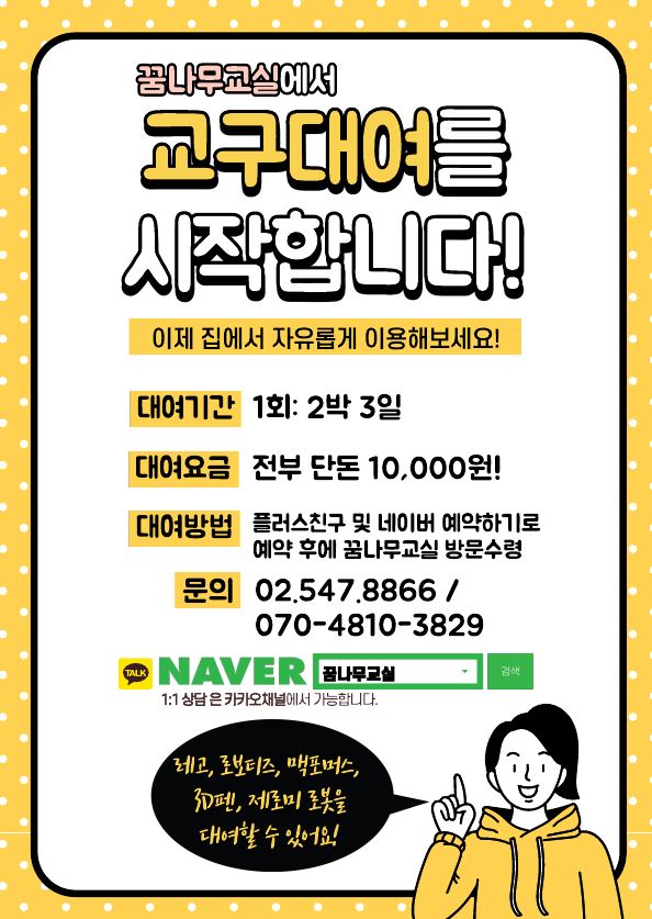 대여방법>> 카카오톡 플러스친구 또는 네이버 예약하기로 예약 후, 꿈나무교실에 방문하여