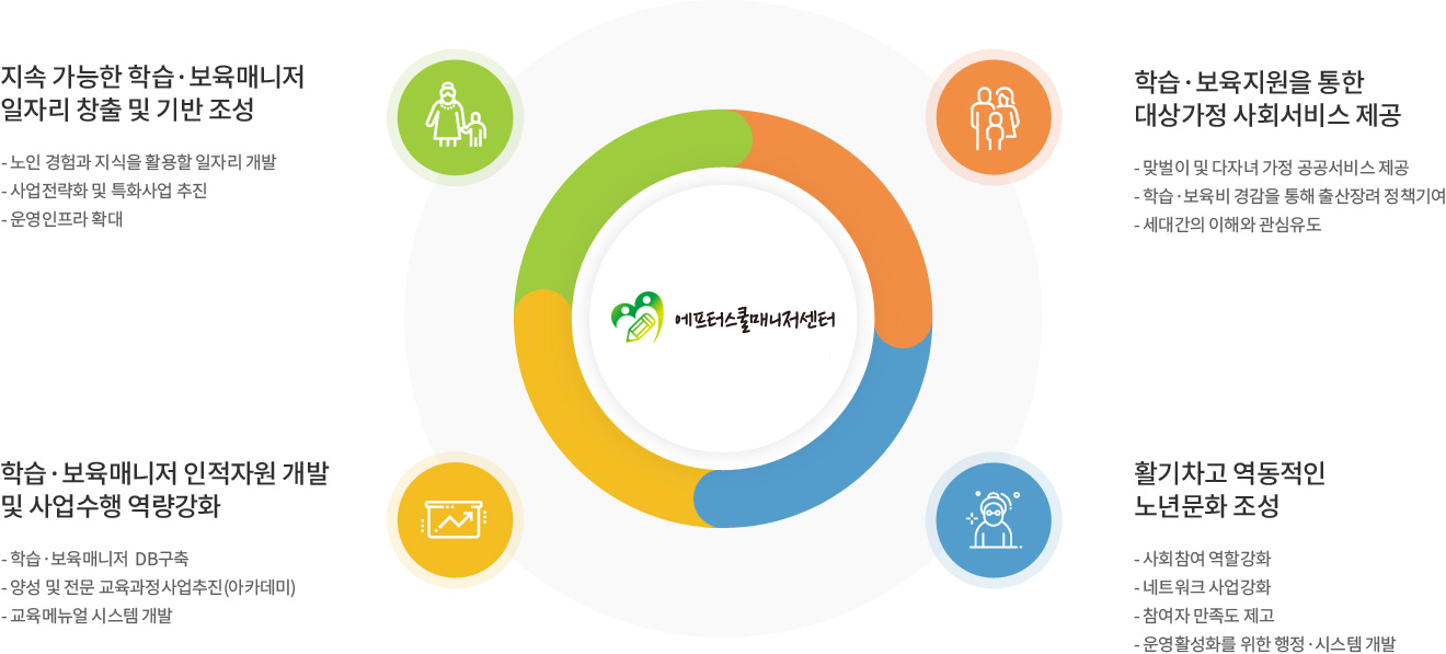 시니어들의 안정적인 소득지원과 맞벌이 및 다자녀 가정의 학습 및 보육 지원을 위하여 운영하고 있습니다.