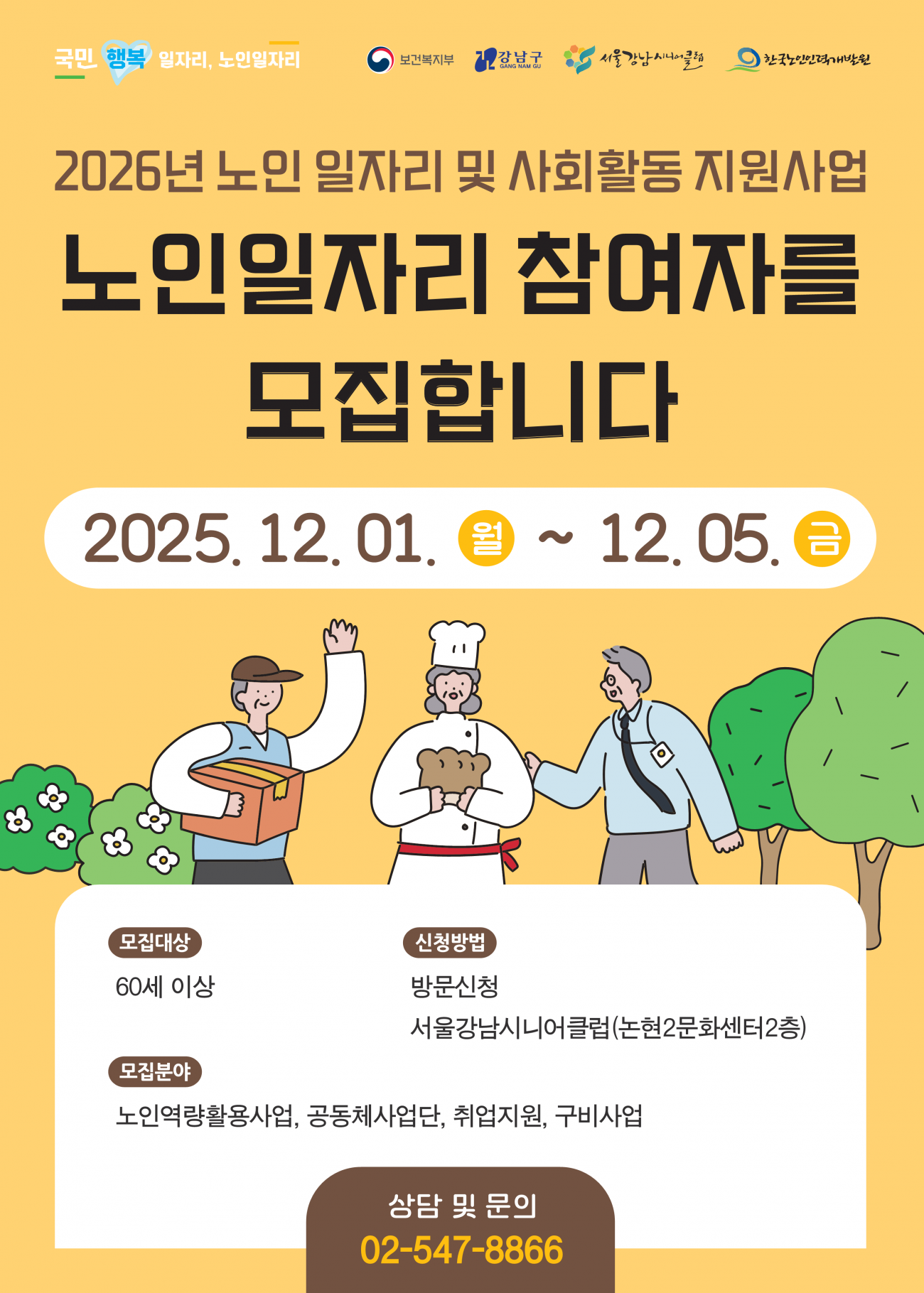 이에 노인일자리사업 참여에 관심이 있는 지역사회 시니어를 대상으로 “2026년 서울강남시니어클럽 노인일자리사업 사업설명회”를 통해 사업 소개와 활동 사항을 안내드리고자 하오니, 관심 있는 분들의 많은 참여 바랍니다.