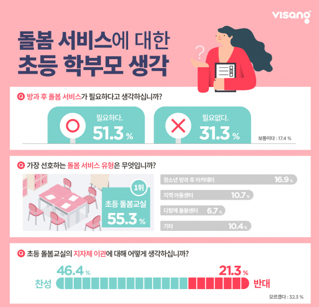 코로나19의 장기화와 함께 맞벌이 가구의 돌봄 수요가 늘면서 초등 학부모 2명 중 1명은 방과 후 돌봄 서비스가 필요하다고 생각하는 것으로 나타났다. 교육 문화 기업 비상교육이 초등 학부모 교육정보 커뮤니티 '맘앤톡' 사이트를 통해 지난 12월 1일부터 31일까지 학부모 회원 403명에게 '돌봄 서비스'를 주제로 설문조사를 실시한 결과(사진), 응답자의 51.3%는 '방과 후 돌봄 서비스가 필요하다'고 답했고, '초등 돌봄교실 지자체 이관'에 대해서는 다수가 '찬성'하는 것으로 조사됐다고 9일 밝혔다.