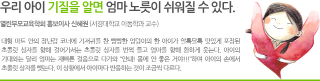 대형 마트 안의 장난감 코너에 기저귀를 찬 빵빵한 엉덩이의 한 아이가 알록달록 맛있게 포장된 초콜릿 상자를 향해 걸어가서는 초콜릿 상자를 번쩍 들고 엄마를 향해 환하게 웃는다. 아이의 기대와는 달리 엄마는 재빠른 걸음으로 다가와 “안돼! 몸에 안 좋은 거야!!!”하며 아이의 손에서 초콜릿 상자를 뺏는다. 이 상황에서 아이마다 반응하는 것이 조금씩 다르다.